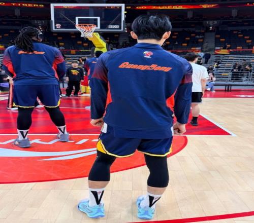 张洪硕扣篮被拉下来,落地左脚先落地又一个反关节扭曲,随后他跳着下场。