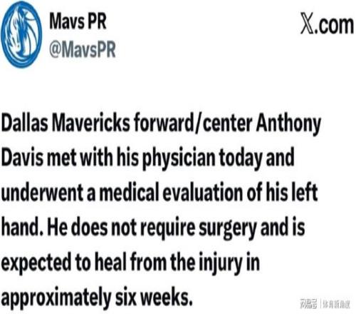 独行侠那边风风火火地官宣啦:浓眉哥那左手的伤啊,就像个调皮鬼,不过好在不用动刀子“修理”,大概六周时间,它就能乖乖“归位”,让浓眉哥重回赛场啦。