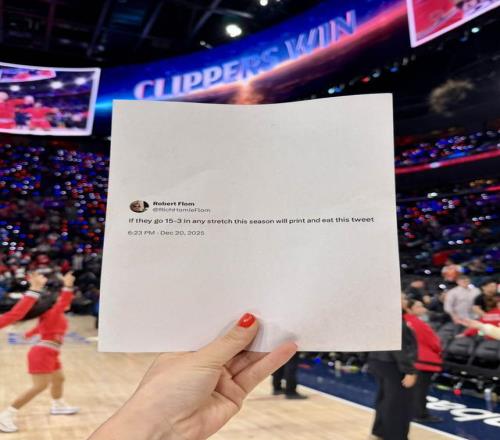 值得留意的是,此前有球迷在个人社交媒体声称,若快船能在本赛季任意阶段获得15胜3负的战绩,他会将这条推文打印出来吃掉。而在本场比赛结束后,这名球迷也在第一时间发推表示,自己将会直播履行承诺。